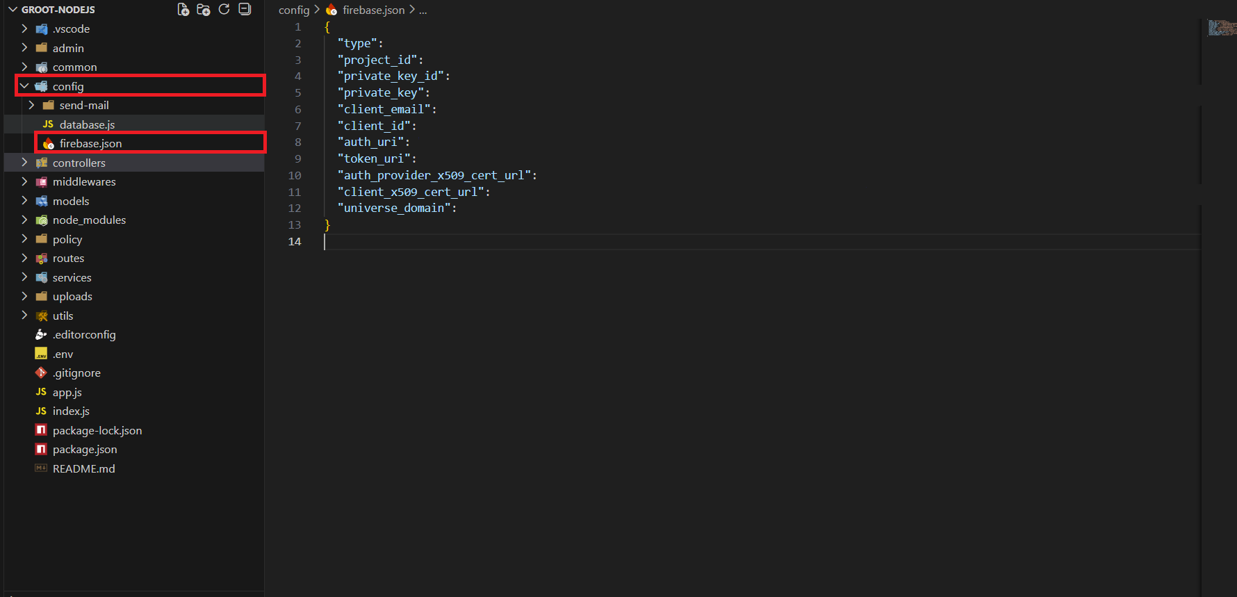 - Please update the downloaded private key file in the 'config' folder of the code and rename it to firebase.json.