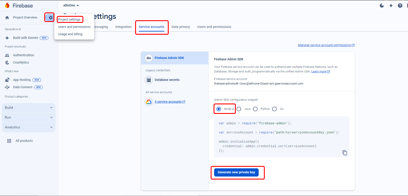 - If you have multiple projects, select the Firebase project for which you need the private key.